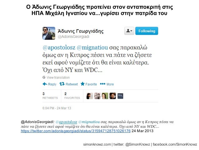 Adwnis Gewrgiadhs On Twitter Diabaste Tis 8eseis Toy K 3an8oy Ws Armodioy Tomearxh Toy Syriza Kai Toy Polakh Gia Ena Toso Sobaro 8ema Den Prepei Oyte Na Milane Meta3y Toys Pleon Https T Co X746qdmplx from pbs.twimg.com 68,188 likes · 24,672 talking about this. Sep 24, 2020 · twitter feed άδωνις γεωργιάδης @adonisgeorgiadi τώρα να σας πω ότι μου κάνει εντύπωση θα σας έλεγα ψέματα. Επικρίσεις για ομοφοβία και ρατσισμό Ο άδωνις γεωργιάδης και ο αδερφός του, λεωνίδας, καταδικάστηκαν ως εκδότες πρωτόδικα για προσβολή πνευματικής περιουσίας. Στις βουλευτικές εκλογές της 16ης σεπτεμβρίου 2007 εξελέγη βουλευτής με το λαοσ στην β΄ εκλογική περιφέρεια αθηνών. Στις 17 φεβρουαρίου 2012 προσχώρησε στη νέα δημοκρατία, έχοντας παραιτηθεί από τη βουλευτική του έδρα. Στις 11 νοεμβρίου 2011 τοποθετήθηκε υφυπουργός ανάπτυξης με αρμοδιότητα την ναυτιλία στην κυβέρνηση παπαδήμου. Εξελέγη με το ψηφοδέλτιο της νδ στην β΄ αθηνών στις εκλογές στις 6 μαΐου 2012 και εκ νέου στις εκλογέςτης 17ης ιουνίου.